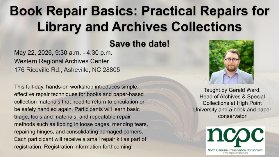 The North Carolina Preservation Consortium awards grants up to $2,000 for projects related to preservation assessments, collection assessments, preservation consultations, preservation project work (physical treatment), environmental monitoring equipment, storage furniture and enclosures, digital and media storage, tools and equipment, conservation of collections, education and training, or interpretation and accessibility.