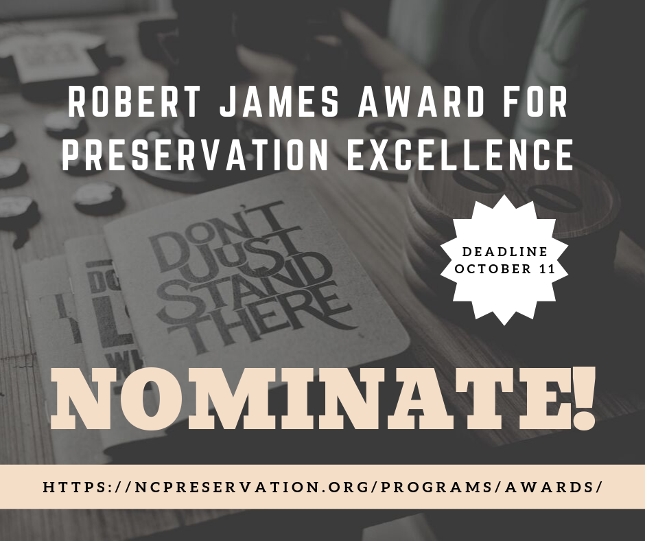 Nominations are being accepted for the Robert James Award for Preservation Excellence. Libraries, museums, archives, historic sites, and other organizations in North Carolina with a mission to preserve tangible heritage of enduring value are eligible for nomination.